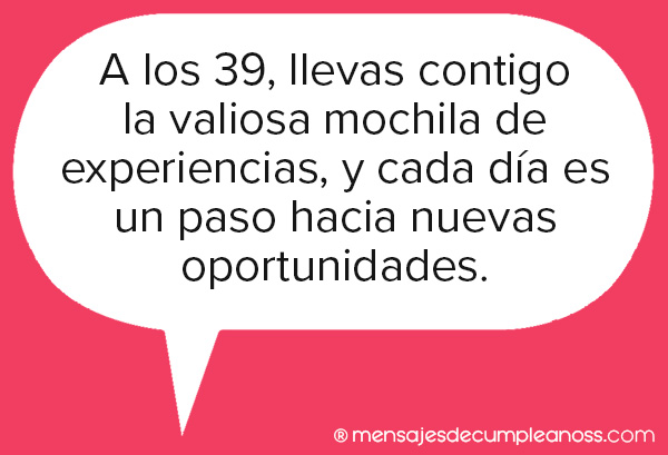 • A los 39, llevas contigo la valiosa mochila de experiencias, y cada día es un paso hacia nuevas oportunidades. ¡Feliz cumpleaños y que tu camino sea luminoso!