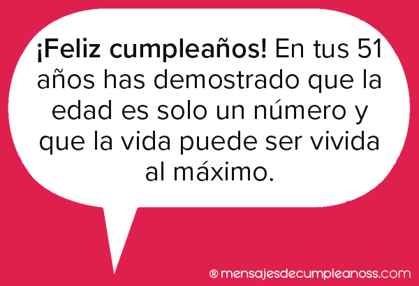 • Felicidades por tus 51 años. Eres una persona valiosa y especial, y te mereces toda la alegría y felicidad del mundo. ¡Que este cumpleaños sea el mejor hasta ahora!