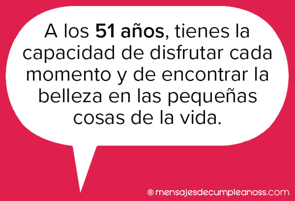 • A los 51 años, tienes la madurez para apreciar las cosas simples de la vida y la determinación para perseguir tus sueños. ¡Feliz cumpleaños y que nunca dejes de sorprenderte!