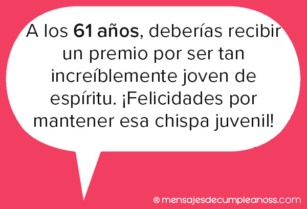 - A los 61 años, tienes la oportunidad de disfrutar de las recompensas de una vida bien vivida. Que este cumpleaños sea el comienzo de una nueva etapa llena de éxitos y realizaciones.