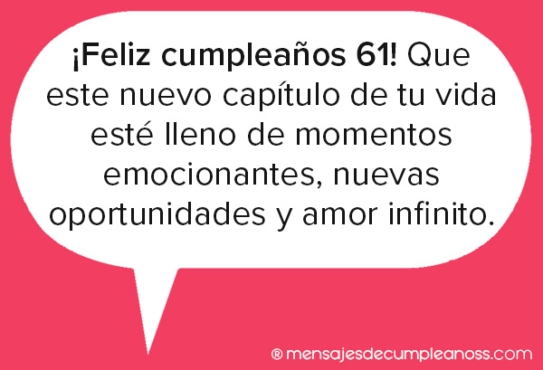 - A los 61 años, te deseamos un cumpleaños lleno de risas, abrazos y momentos de plenitud. Que cada día de este nuevo año esté lleno de felicidad y gratitud.